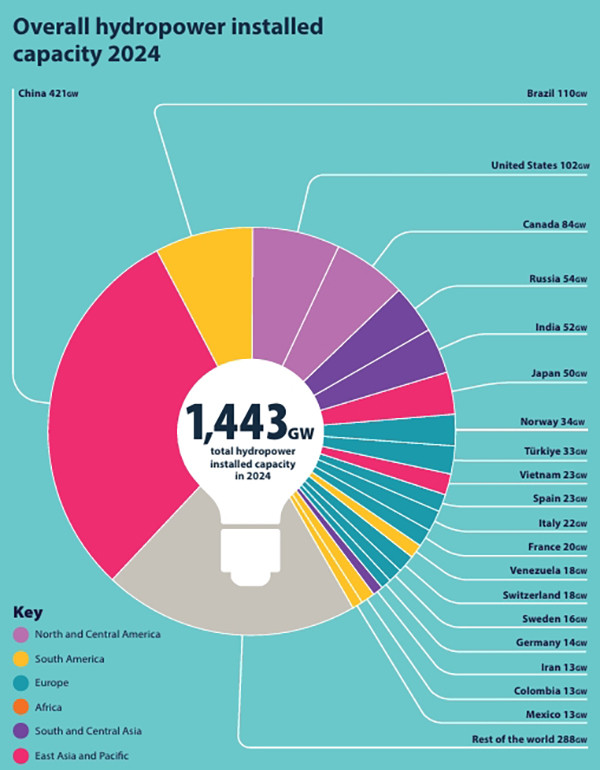 截至2024年,全球水电装机总容量饼状图国际水电协会
